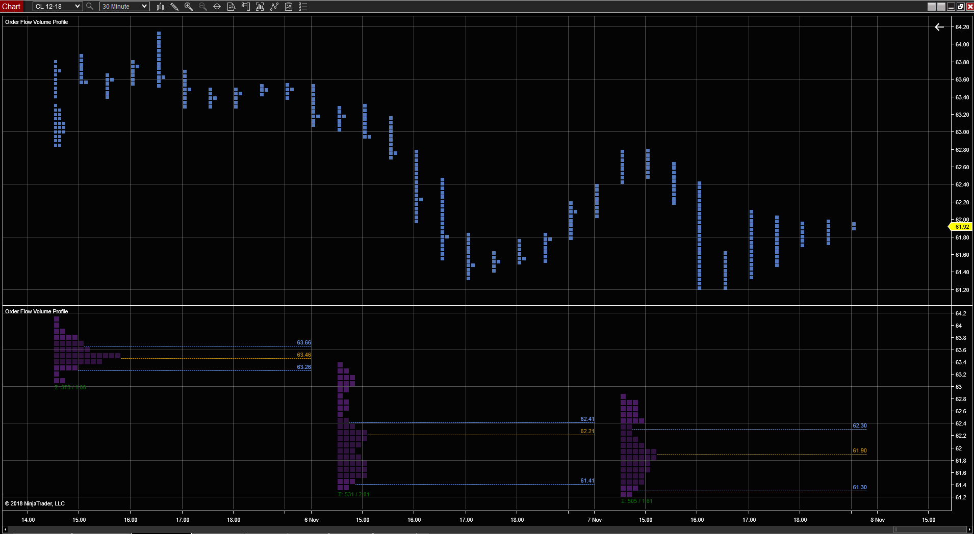 Here is the same chart as my example in post #11 but split into two separate panels instead of overlayed in one panel - there is one 1440m RTH data series with your Volume Profile settings applied, and another 30m RTH data series with the same Volume Profile applied - screenshot. Both the post #11 screenshot and this screenshot have the 'Nymex Energy RTH' trading hours template applied, so I don't understand what you mean when you say "profile is built on the right (after market close) and facing the right". Can you elaborate?