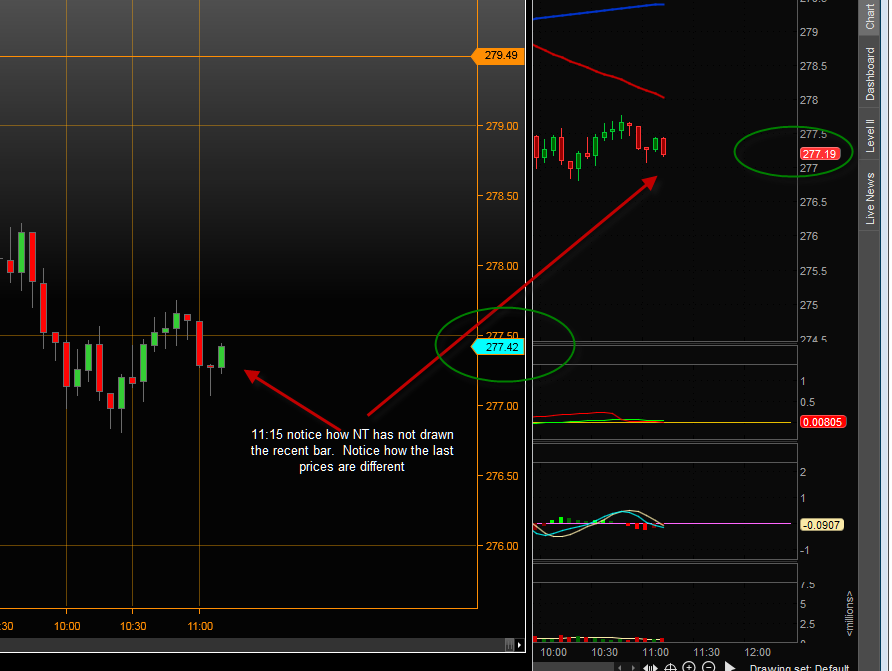 I have 4 charts open in NT8 - 3 SPY & ES. I have 1 3rd party indicator running on each chart. I noticed that there was a difference between the Last Trade displayed on the charts and the other two data feeds which agreed with each other. I thought it was the Kinetick feed so I sent a query to them. On a hunch I clicked to Update the Historical Data on one of the Charts. Turnns out thatt the chart was not updating. After updating the data the Last Prices agreed across all of the feeds and the NT charts updated as well. Then afterf a couple of minutes it appeaars tht the Last Price on the NT charts starts to slow down relative to the other data feeds . For example the other two feeds for the SPY right now read 277.31, NT is 277.10. Its minor but they should all agree to a certain extent.