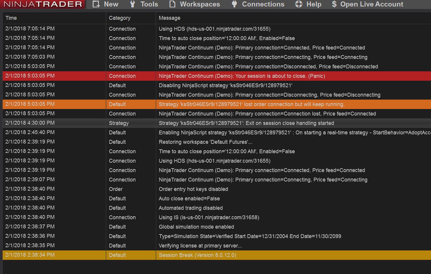 I'm losing connection at the end of the session. Strategy is disabled. This is normal? I want to put my strategy on the VPS for 24/7 work. Did I set the right strategy for this? I want the strategy not to be disabled and the connection not lost. Please look at the log.Tags: None