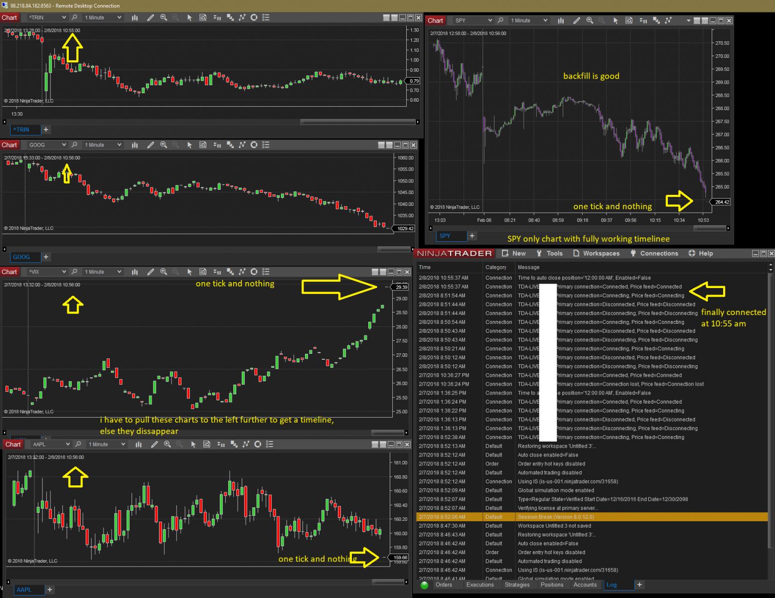I have just spoken to TDA tech support, and they confirmed there was an issue (yesterday 08/Feb/2018) with one of their servers to which NT8 was trying to connect. They fixed the issue by re-directing NT8 to another server. Here is an idea which I discussed with TDA and they said it could be a good idea to work with your developers if they were interested. The idea is this, a while ago I used a small software called "strategydesk", which had an option to swap/change servers within TDA, and it could make for a better/more robust API connection between NT8-TDA IF there is no response from a specific TDA server, to AUTOMATICALLY change and try a different server address. Forgive me, my tech knowledge is basic, but I am very keen to throw you ideas in case this has not been thought about. Market wise, yesterday was a missed day, and hell of a missed day, sometimes you have to wait years to see that kind of price action. Thank you.