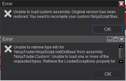 Unable to load custom assembly. Original version has been restored. you need to compile your custom NinjaScript files.