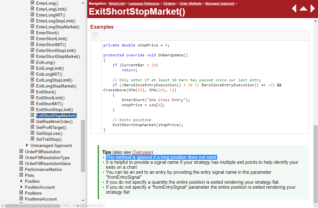 If you look at your NT8 help for the method ExitShortStopMarket(), you'll see the 1st tip "This method is ignored if a long position does not exist", but it'd be "This method is ignored if a short position does not exist" instead, right? Please confirm.