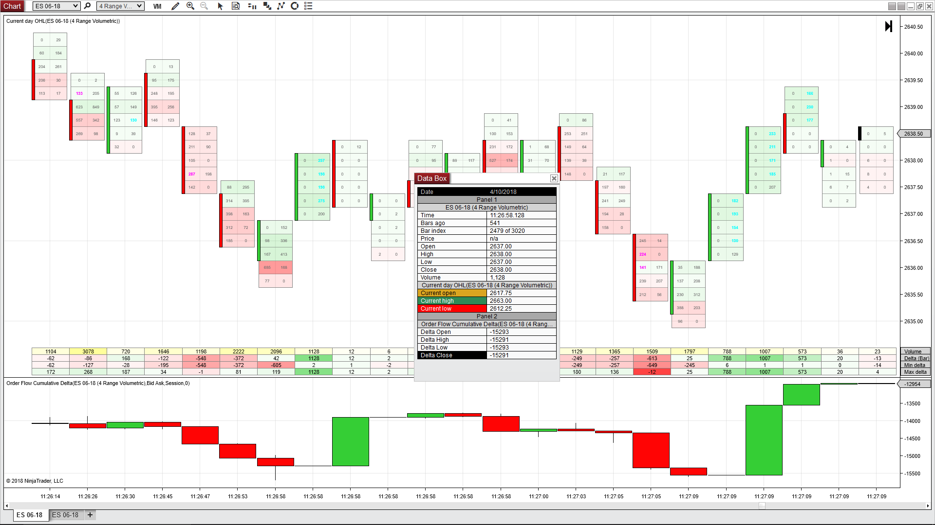 Thank you for your response Alan. For your further review, I've included a similar, and more severe discrepancy today on the ES contract. This time the period is set to "Session". Please note the delta values at the bars at 11:26:58 and 11:27:09. The changes in delta on the cumulative indicator are not happening on the correct bar.