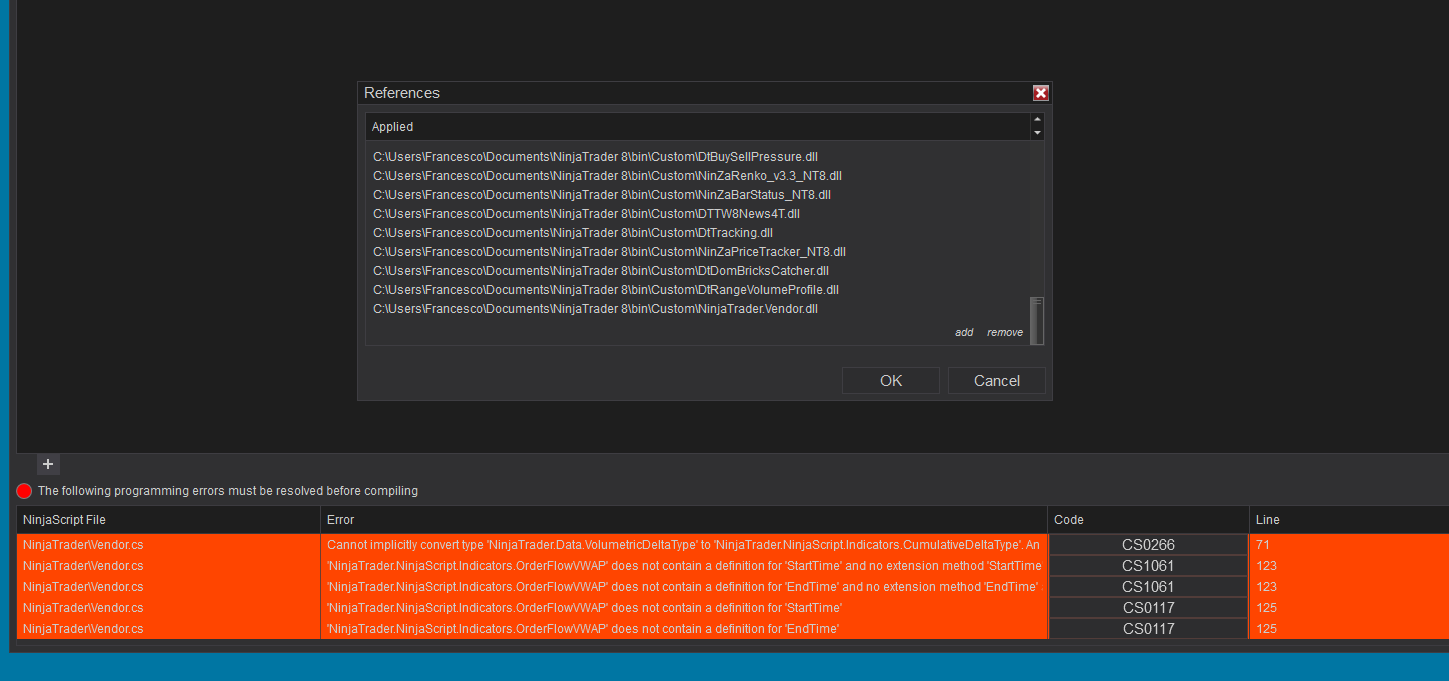 - Delete 'NinjaTrader.Vendor.cs' and 'NinjaTrader.Vendor.dll'
