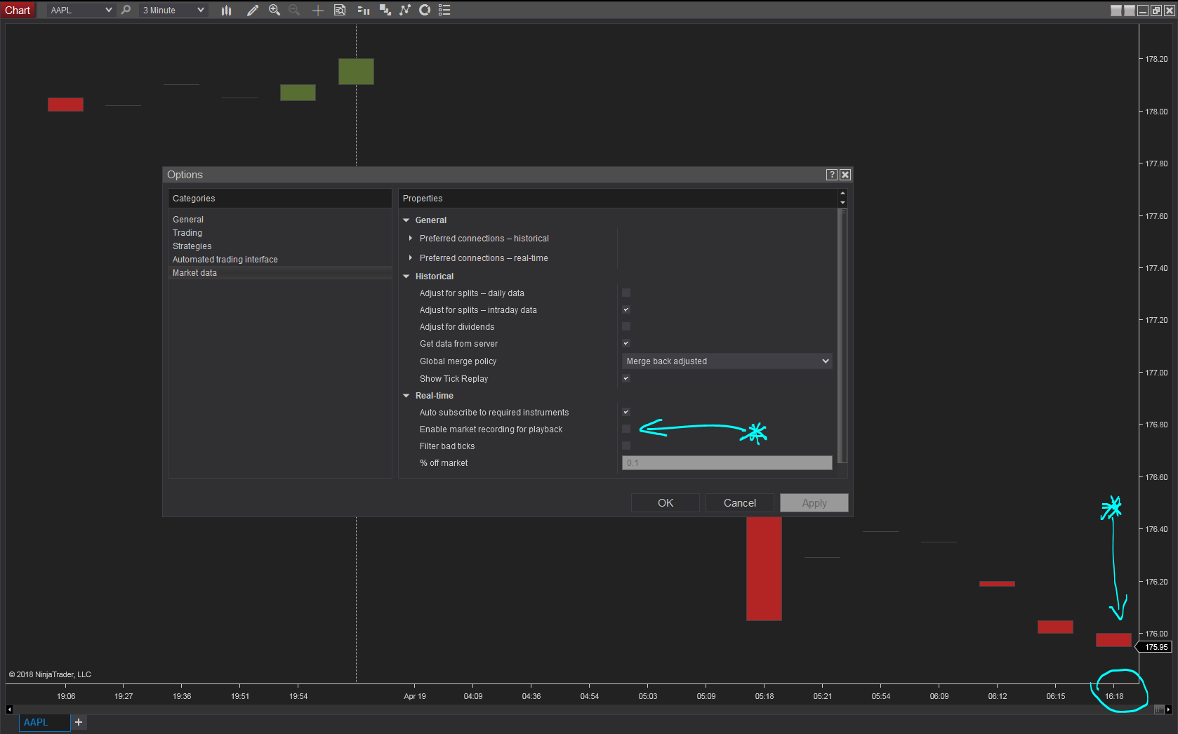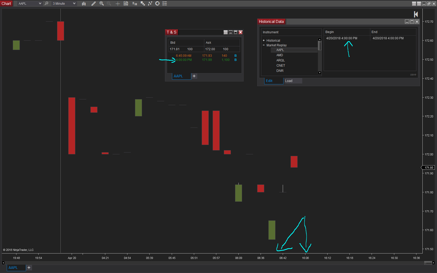 - I have been testing with all other work-spaces closed and just one work space open with only a chart and no indicators or scripts. The same issue was present in the chart. I have attached a screen shot from this morning(please note that Market Replay recoder was not enabled). (sorry I should have stayed with CGIX, but I wanted to make sure it was something that was trading at 6:30AM, so I chose AAPL.) I want to point out again, that this new bar print taking the hour to be 16:00 seems to be independent of Market Replay Recorder issue.