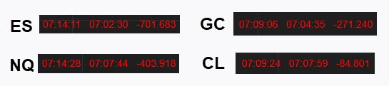 ES, NQ, GC, and CL lagged (high trade rates). RTY and ZB (lower trade rates) lagged at first on news, but cleared quickly.