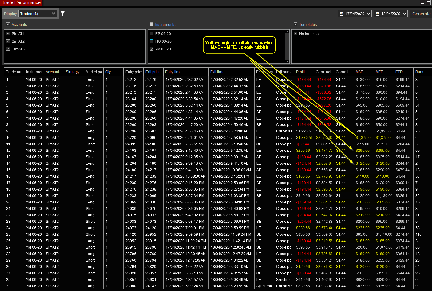 Clear example: Multiple trades, some winners, some losers,and MAE/MFE are both reported as the SAME VALUE !!! Seriously, that is so wrong it is not funny. And no appeals to Bid/Ask etc, or indeed any other factor, alter the fact that the CODE IS CLEARLY WRONG !!!