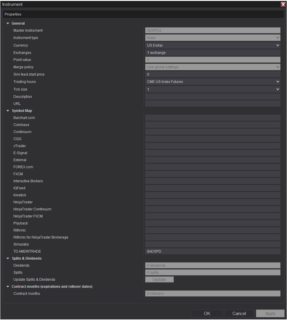 I would like NT8 to pull ADSPD ($ADPSD on TDA) from TDA but it doesn't appear to want to. I read the multiple connections help guide and set my preferred data connection for both equities and indexes to TDA while leaving Continuum to handle futures.
