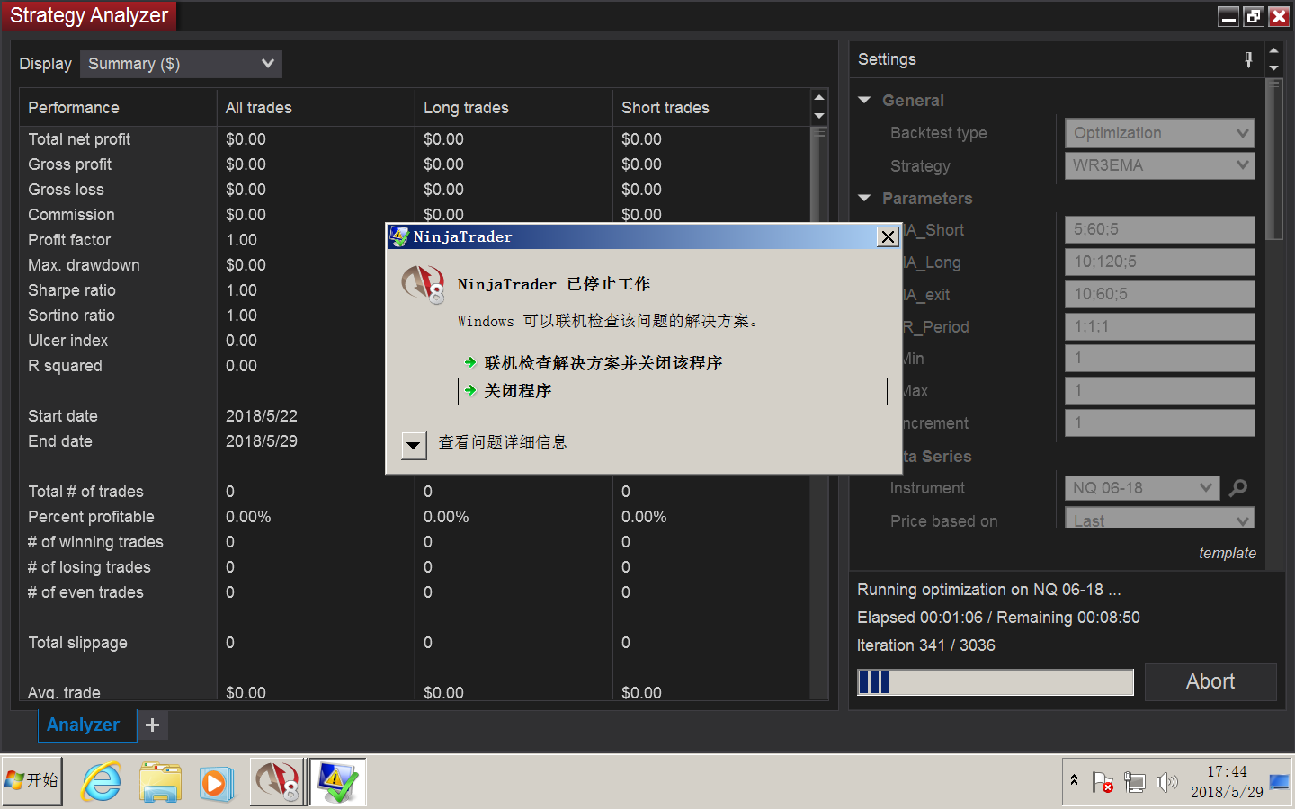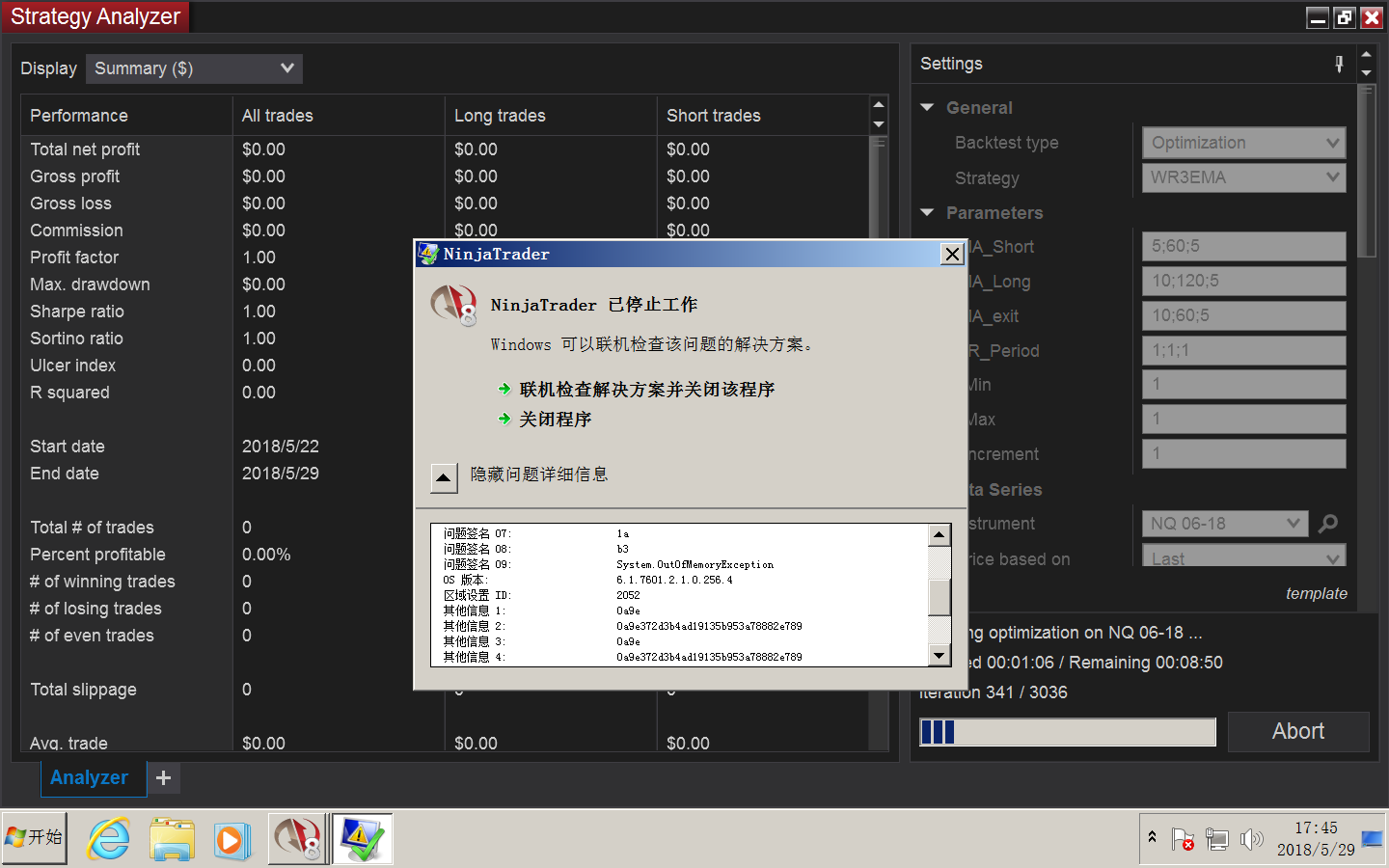 Opimisation for 3 parameters eat up whole memory and crash. Just built-in strategy builder involved. Tried on 16G I-8700 CPU Win 10 Platform. Whenever NT8 took the total memory , it crashed. Does a licensed version make a different ?Tags: None