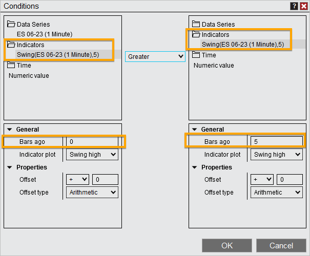 To compare the current bar Swing value to the Swing value 5 bars ago, you could set the 'Bars ago' property to 5 where the arrow is pointing in the first screenshot you shared.