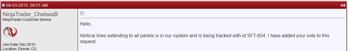 In using the drawing tools, I've only been able to draw a vertical line through one window pane at a time. For example, If I have a price pane and 2 indicator panes underneath, I use F7 on the chart and it only paints the line on the price pane, not the indicator panes. So if I have a signal at 9:35 am that I want to mark as a setup, I have to go F7, click into the price pane at 9:35, then do the same thing twice again in each of the indicator panes to get a line though the entire chart to mark what my signal looked like at 9:35. Is there a way to have a vertical line go all the way from top to bottom of the entire chart in one move?