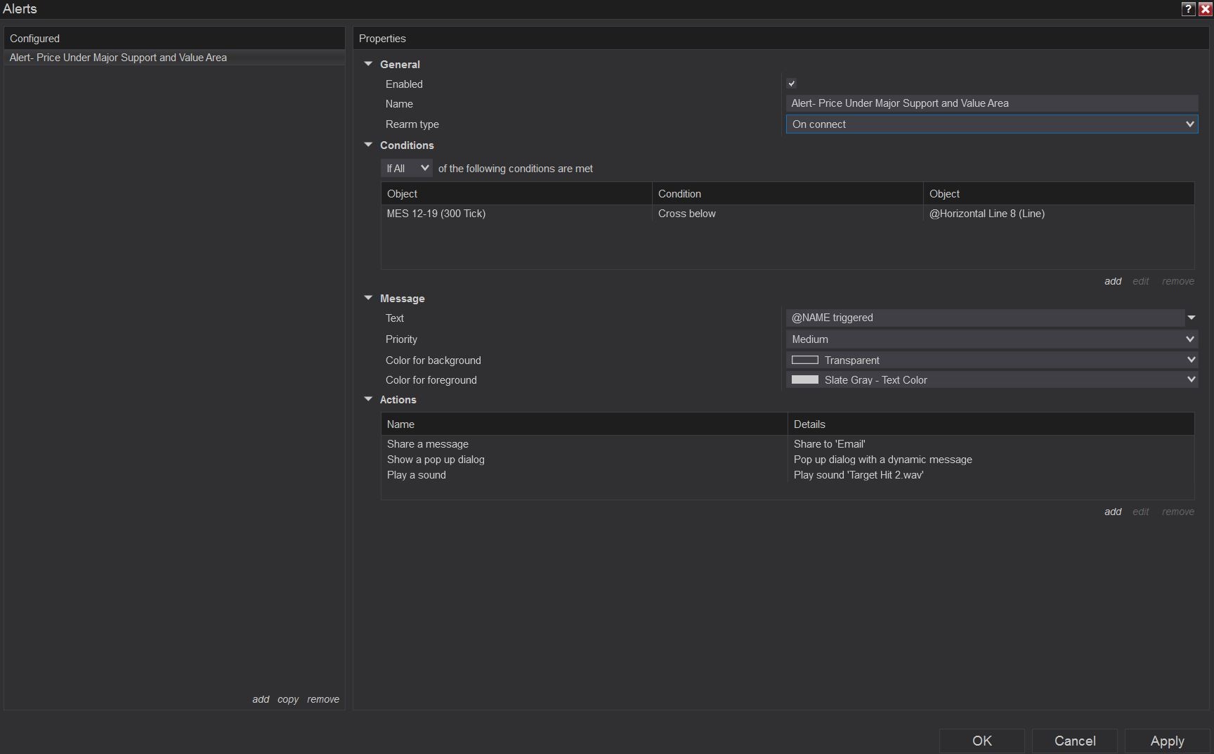I looked around but cant seem to fine a way to set an alert for when price moves under a major support area and also under the volume profile VPOC.