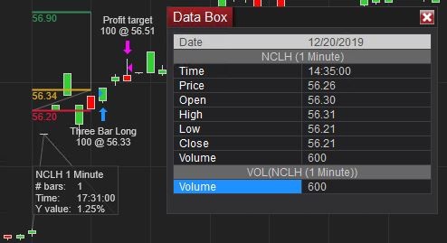 My plan is to test this entry method again in backtesting so I created an export of the NCLH.Last.txt prices (attached) using tools > export > historical data, for the past few days as my strategry requires 35 historical prices to trade. I removed all data on my test machine for NCLH in tools > historical data. I then imported the NCLH.Last.txt prices back in using tools > import historical data > default settings. The imported data shows the red bar high is at 56.26.