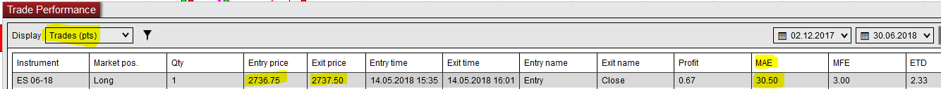 NT8 report: small winner, with MAE of 30.50 points ( = 122 ticks)