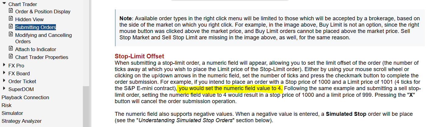I've hilited the area that says you must set the offset ot +4 to have the limit price offset by 4 ticks when setting up a Buy or Sell stop-limit.