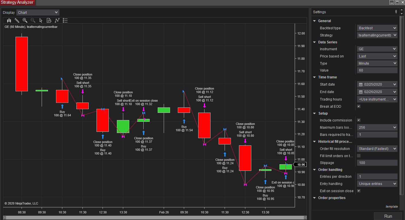 your explanation for the behavior of the alternating strategy is brilliant and makes perfect sense. it also mentions something that i have given thought to, and that is that the nt platform correctly processes all orders at the open of the following bar which is the most credible and logical way to proceed (other crappy platforms have two options: generate order on the next bar at open or on this same bar at close which leads to nonsense and delusion after gaps in price, but anyway).