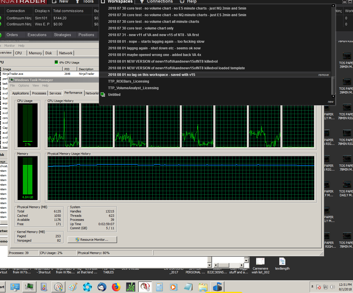 probably the most interesting picture was the one of taskmanager performance showing all the memory being chewed up and not released when the corrupted workspace was loaded.... with nothing but NT8 running....