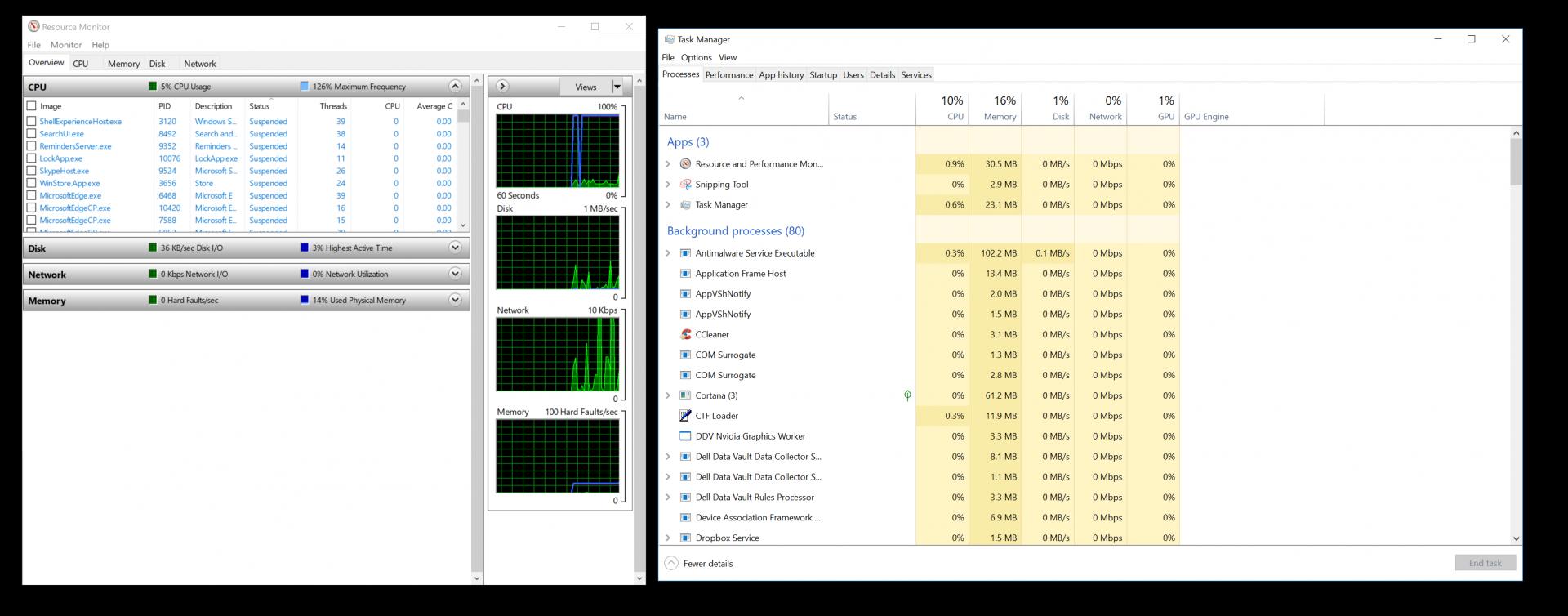 Josh, I've attached 3 screenshots of the Task Manager and Resource monitor. 1) with No apps running 2) with NT8 + blank workspace 3) with NT8 and workspace with 2 monitors,