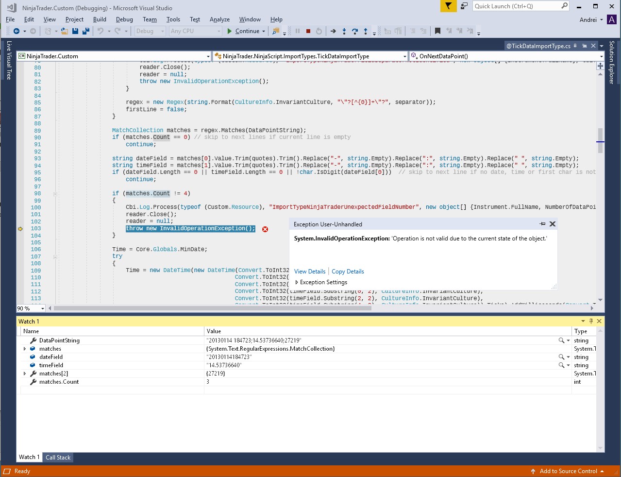 8/4/2018 12:39:45 AM NinjaScript Import type 'Tick Data, LLC': Error on calling 'OnNextDataPoint' method: System.InvalidOperationException: Operation is not valid due to the current state of the object. at NinjaTrader.NinjaScript.ImportTypes.TickDataImport Type.OnNextDataPoint() in c:\Users\av240\Documents\NinjaTrader 8\bin\Custom\ImportTypes\@TickDataImportType.cs:li ne 106 at NinjaTrader.NinjaScript.ImportTypes.ImportType.Imp ort(MarketDataType marketDataType, TimeZoneInfo sourceTimeZoneInfo, Boolean generateMinuteBars, Boolean generateDailyBars, IProgress progress)