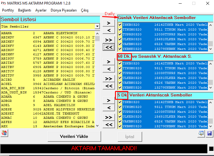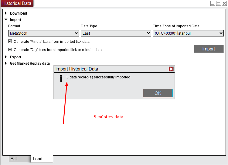Now, if I come to my problem, I can pull the Turkish Stock Exchange data for 5 minutes, 60 minutes and daily in the data provider. I can seamlessly export daily data to NinjaTrader 8. But when I transfer the 5 minute and 60 minute data. I get a message like 0 data was transferred. I am adding screenshots related to the problem.