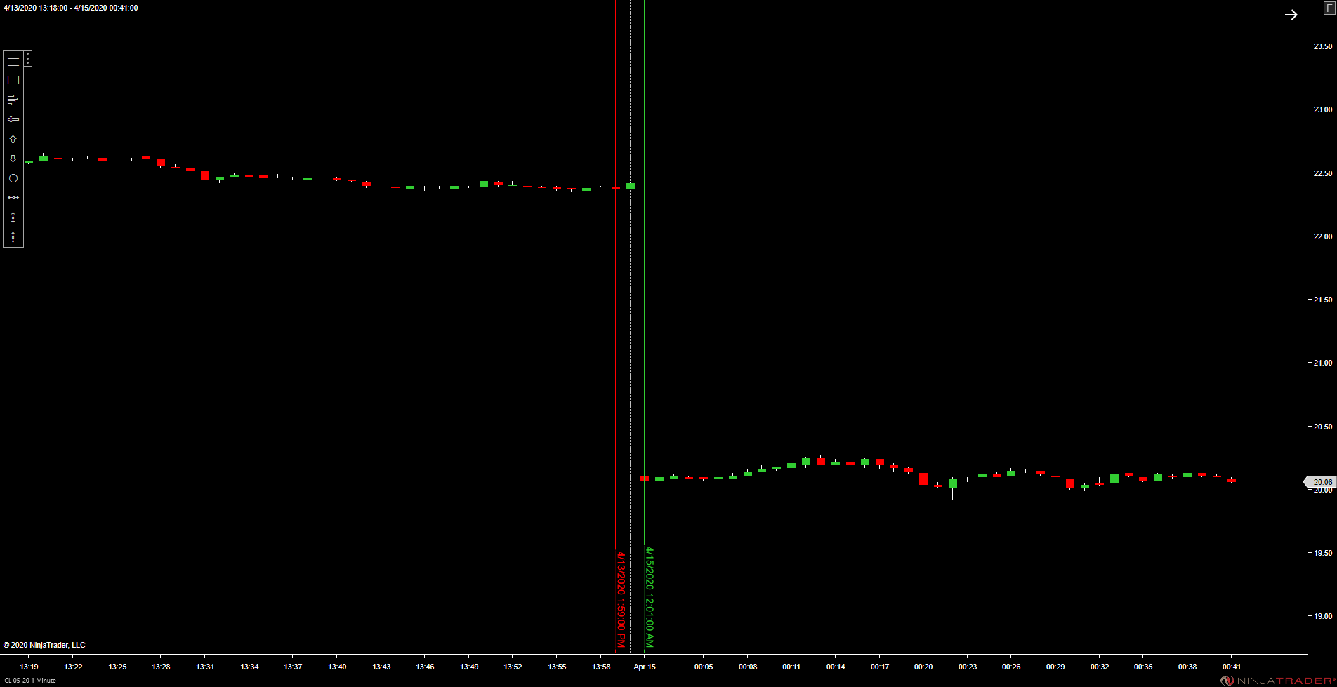 I have attached a daily chart of CL 05-20. This daily chart shows price bars as expected including the dates of 4/13/2020, 4/14/2020 and 4/15/2020. However, when I change to a more granular time based chart, 1 minute, for example, the data from the beginning of the Globex session on 4/13/2020 until 12:01 AM on 4/15/2020 is not displayed (see attached 1 minute chart). This happens for all time based charts regardless of the value selected in the data series, If I change to a tick chart, range chart or renko chart, all the price data is displayed properly (see attached 30 tick range chart).