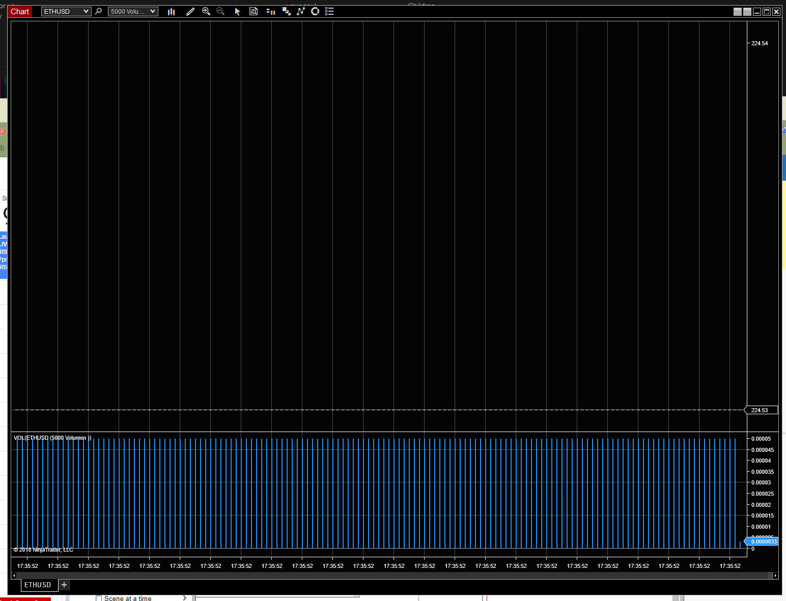 The chart is a stream of singlepoint bars in a stream of time, the timestamps underneath keep updating indicating that it is just printing minimum bars in a constant stream.