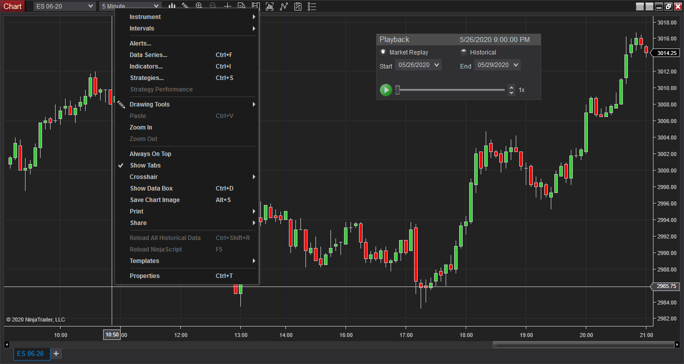 I have used NinjaTrader before and have always been able to right-click within the chart itself and place an order (bid/ask/limit etc). Now I am unable to. The only options I have are attached in the screenshot. I am using ES-06-20 as the futures chart. Am I missing something? Please assist.