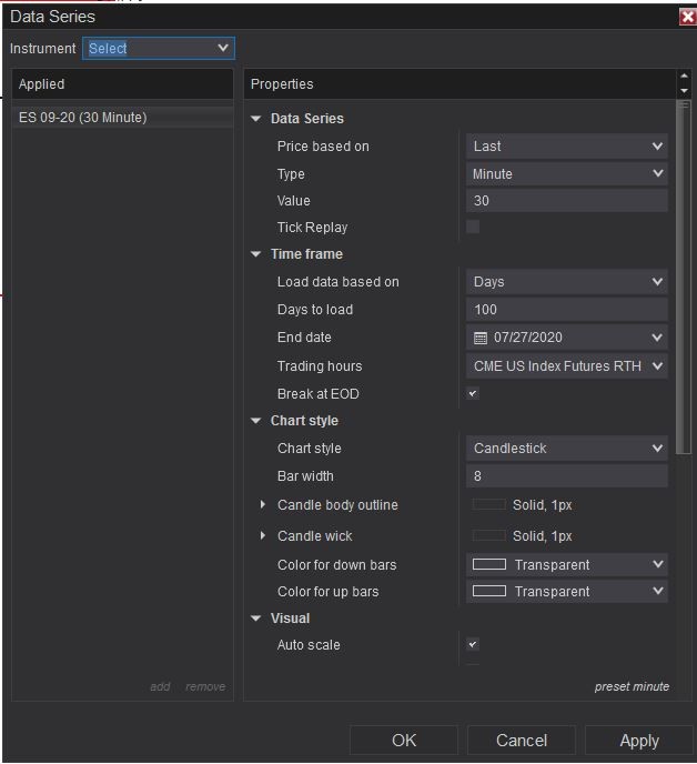 The data series trading hours are set to RTH and the profile's trading hours are set to use the data series settings.