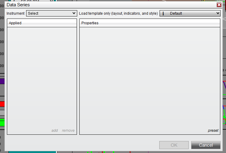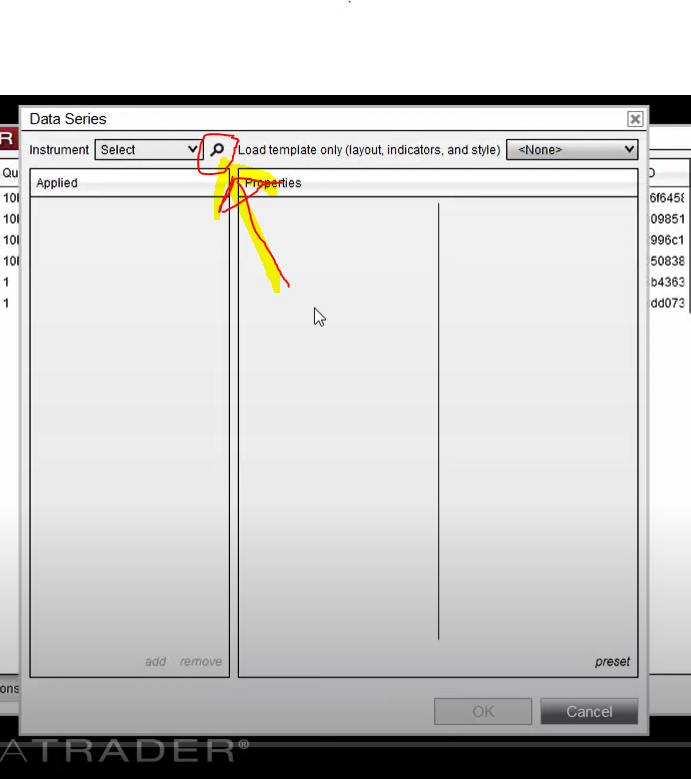 3.Left mouse click on the magnifying glass icon next to the Instrument Selector. In the window that appears, use the search field to search available instruments by symbol or description, then double left mouse click on an instrument in the search results to add it to the list of applied Data Series.