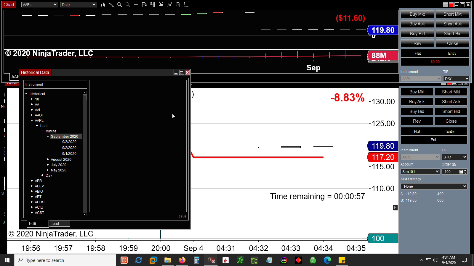 3. Double clicking on "historical" on the left just brings up a list of tickers, not the expected- Last-->Minute-->september 2020-->today's date. The data box to the right of that is empty.
