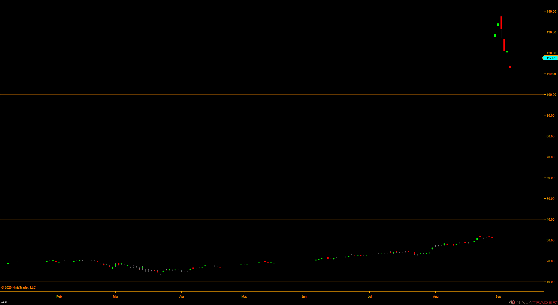 I believe that this may be due to the recent split that occurred. Who do you connect to for data? Did you recently update splits or manually add a split to the AAPL instrument from Control Center > Tools > Instruments?