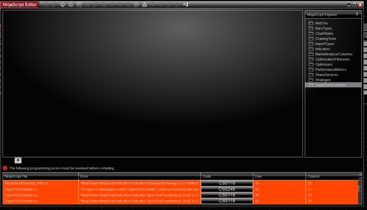 Please follow the instructions below to see where the errors are coming from after compiling the indicator. This will allow you to debug the indicator/strategy or remove it from your PC. If you are wondering why you receive an error when compiling only one indicator, it is because NinjaTrader always compiles all indicators and strategies - not just one. This is done to give you the highest runtime performance possible.- Open NinjaTrader