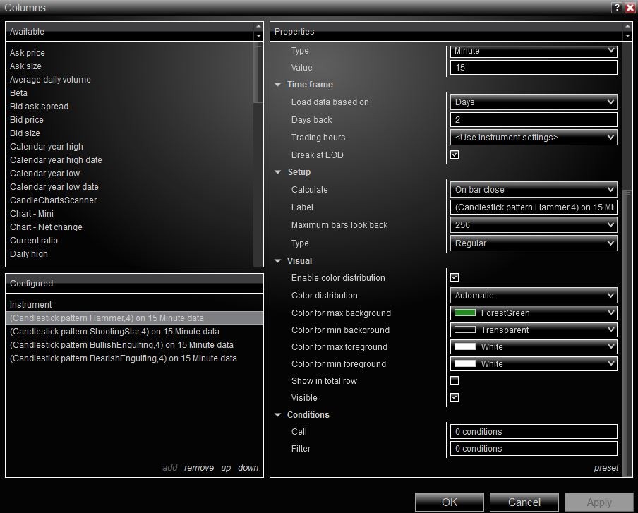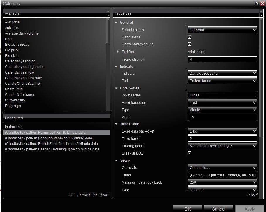 I use Market Analyzer to scan for specific candlestick patterns using the Candlestick Scanner in equities, specifically the S&P 500. Using it intraday on various minute charts it works fine. However, I'd like to be able to scan an end of day daily chart and I haven't been able to make this work. Even though the setting in the setup menu is to calculate 'on bar close' it does not appear to work like this in practice. It appears to only calculate once a new bar has opened, which makes scanning at the end of day impossible. I am also trying out the Nison Candle Scanner and I can't get it to work on the daily chart at the end of the day either. What am I missing? Thanks.Tags: None