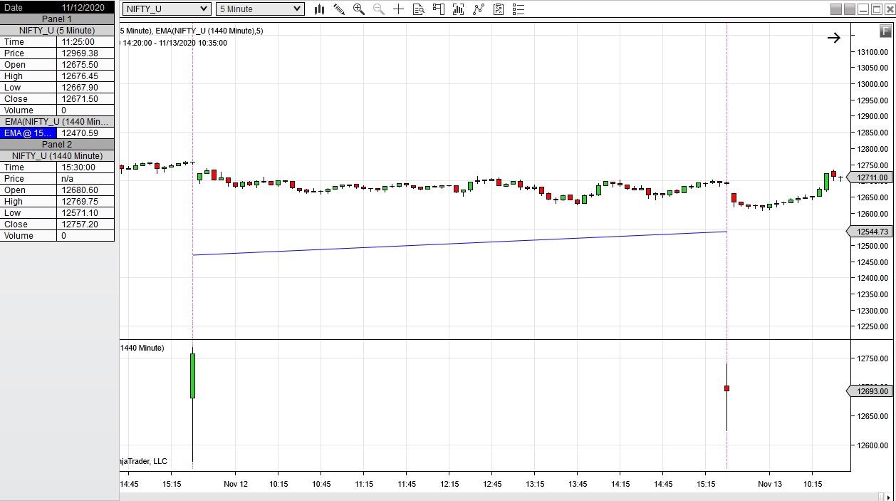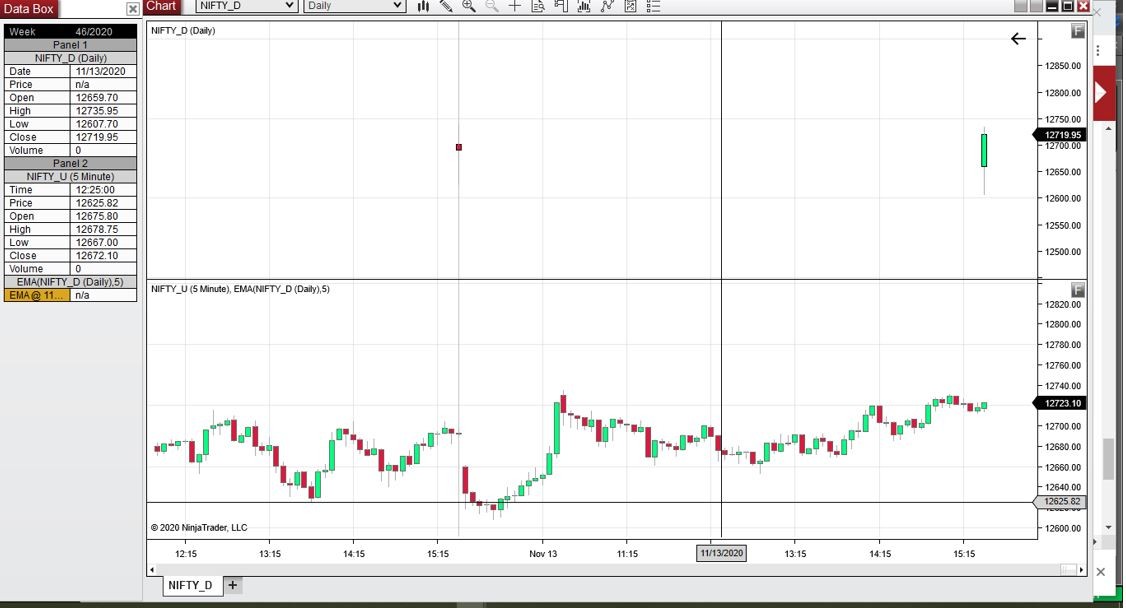 Expectation is that for each 5 min candle on 11/13/2020, OHLC value of 11/13/2020 (daily) should be displayed on panel 1. The session applied is for NSE (9:15 AM to 3:30 PM).