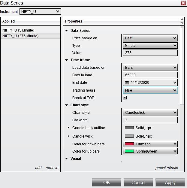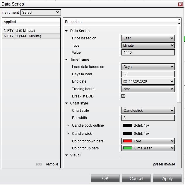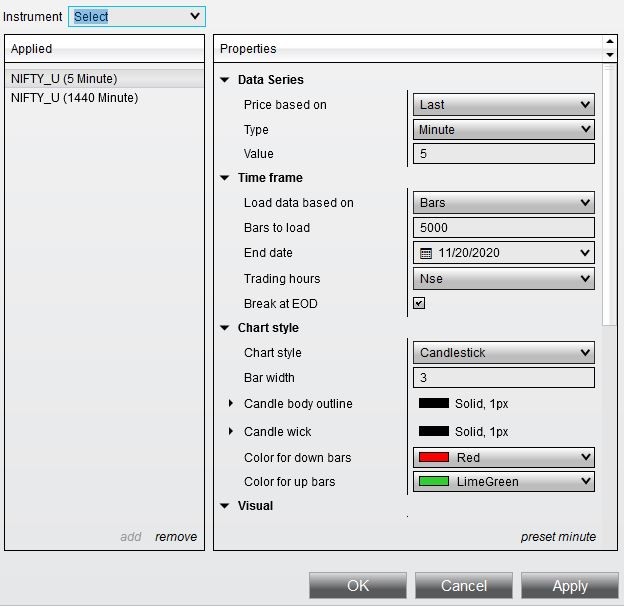 Please note; I have used the NQ instrument in these examples, on the NSE trading hour template. As such, the data would look different to the NIFTY.