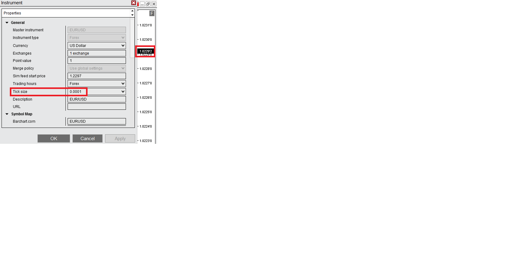 I see this if I have for EURUSD pair Tick size setting of 0.0001. This gets almost fixed when I set Tick size to 0.00001, then I can see: 1.2293'3. There's just still this 5-th decimal number ('3) at the end.