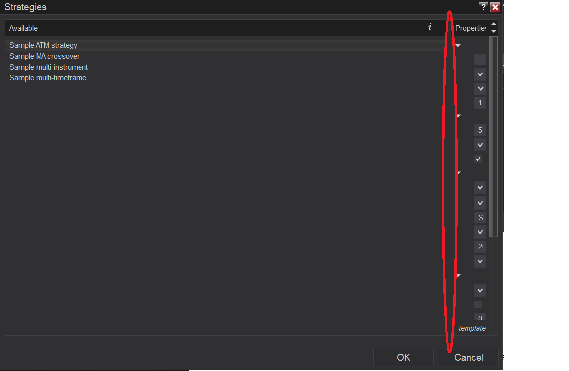 I recently wiped my machine and reinstalled Windows 10 and Ninjatrader 8. The strategies window is no longer showing the properties section to allow configuration of a strategy. I used my previous license key for NT8 for the reinstall. A realtime Kinetick feed is being used. Can you please advise on why the property section of the strategy window is not displaying? Please see attached image.Tags: None
