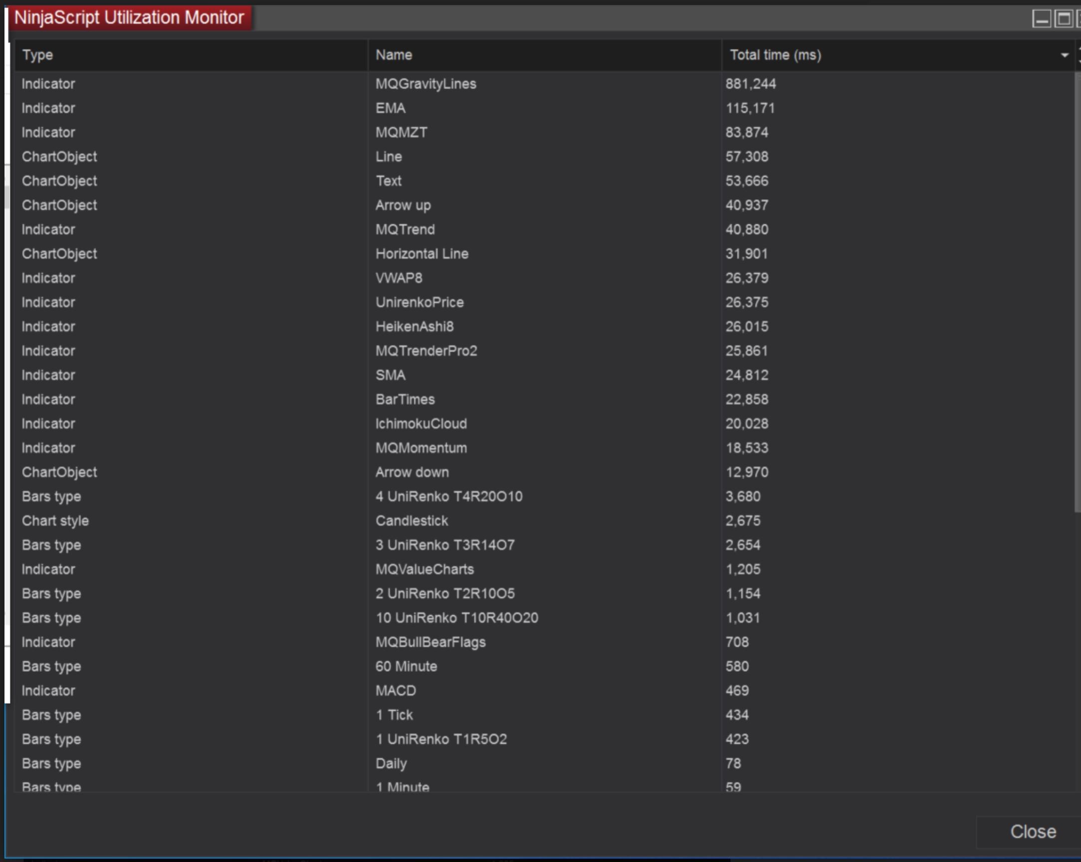 To first explain exactly what the NinjaScript Utilization Monitor displays: This window records how much processing power each indicator, bar type, or chart object uses.