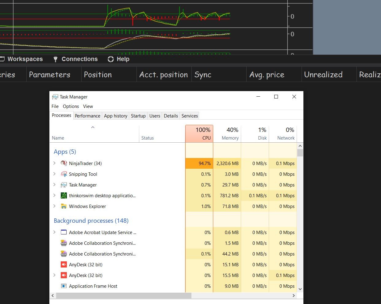 Would this type of processor activity be sufficient to hang NT8, as I can't say for certain and would like to know for sure and also do not want to report to the developer if it happens to be something else. I don't want to unfairly criticize or accuse anyone for a problem that may be unrelated. They are a great team of developers and traders at this particular firm that.