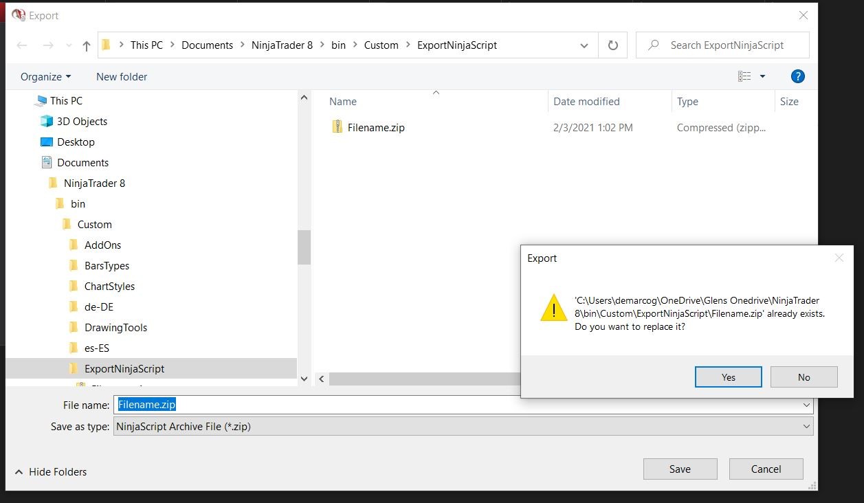 • Look at both the 'InstallDir' and 'UserDataDir' lines near the top of the Trace File - there should be no OneDrive within the mapping. Example: InstallDir='C:\Program Files (x86)\NinjaTrader 8\' and UserDataDir='C:\Users\JDeMarco\Documents\NinjaTrad er 8\'