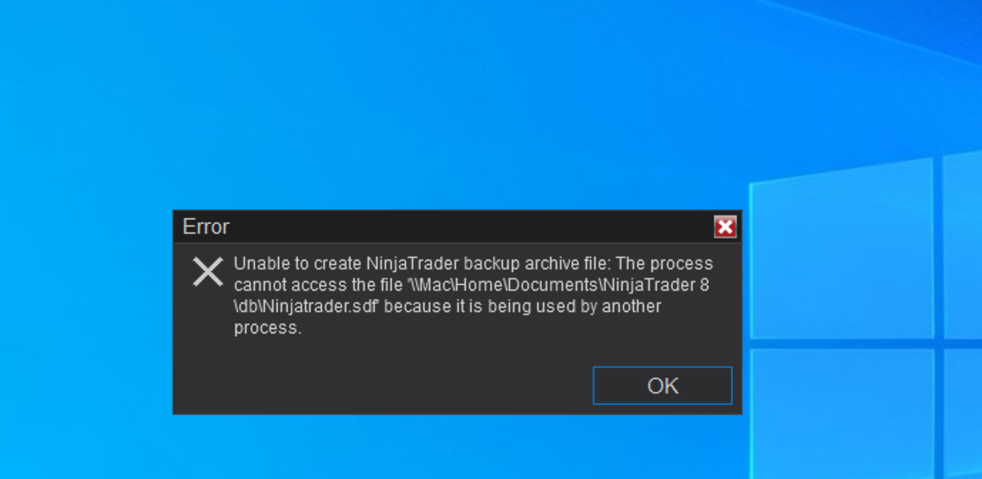 Can you please check if your virus scanner or any other application access/blocks/scans files in the \\Mac\Home\Documents\NinjaTrader 8 folder. NinjaTrader needs to access the database to create the backup file. The error indicates another application was using the file that NinjaTrader was trying to access as well, which resulted in the error.