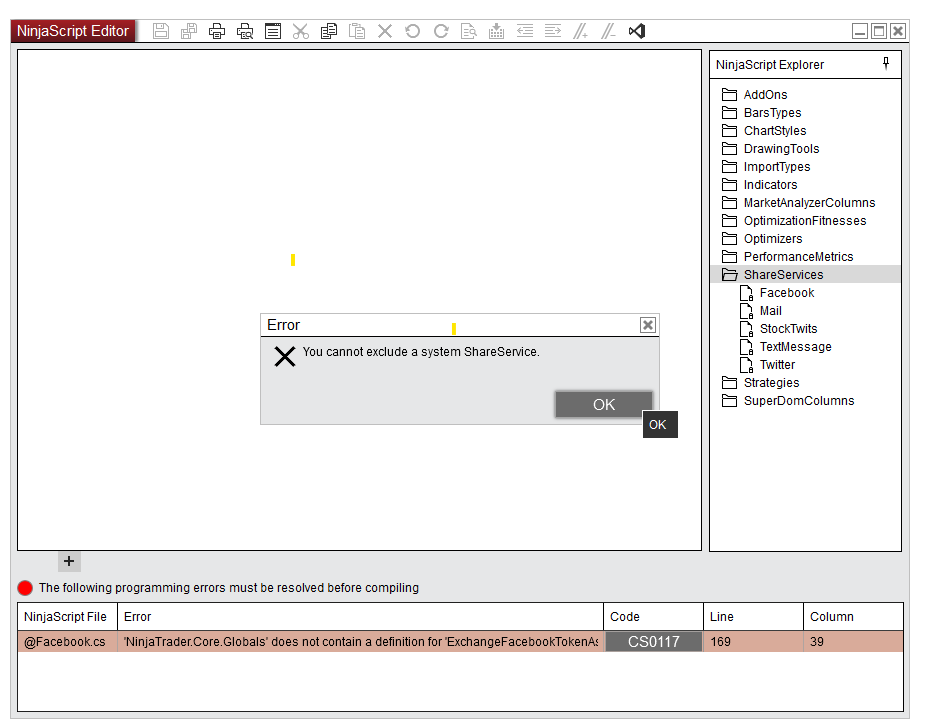 That being said, manually removing the Facebook share service should allow you to compile. Go to Documents > NinjaTrader 8 > bin > Custom > ShareServices and delete the @Facebook.cs file there, then compile again (You can leave NinjaTrader open when deleting).