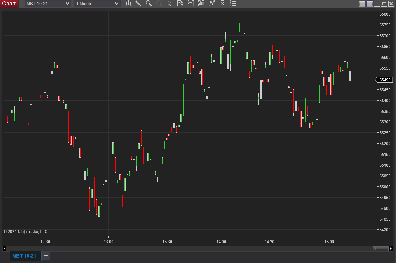 The chart data you load is as expected. I load the same when I test the MBT 10-21. Please note that this futures instrument is not that volatile.