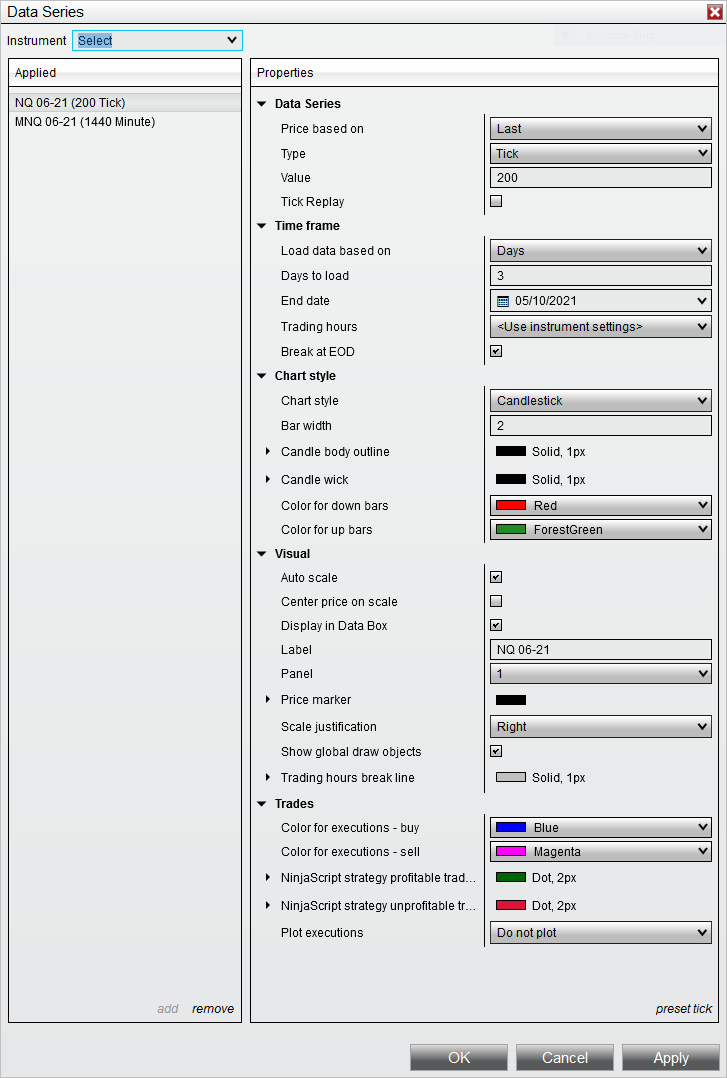 For instance, I watch the NQ instrument on the chart but trade the MNQ, and every morning I have to switch from NQ to MNQ in ChartTrader because NT8 does not save that configuration.