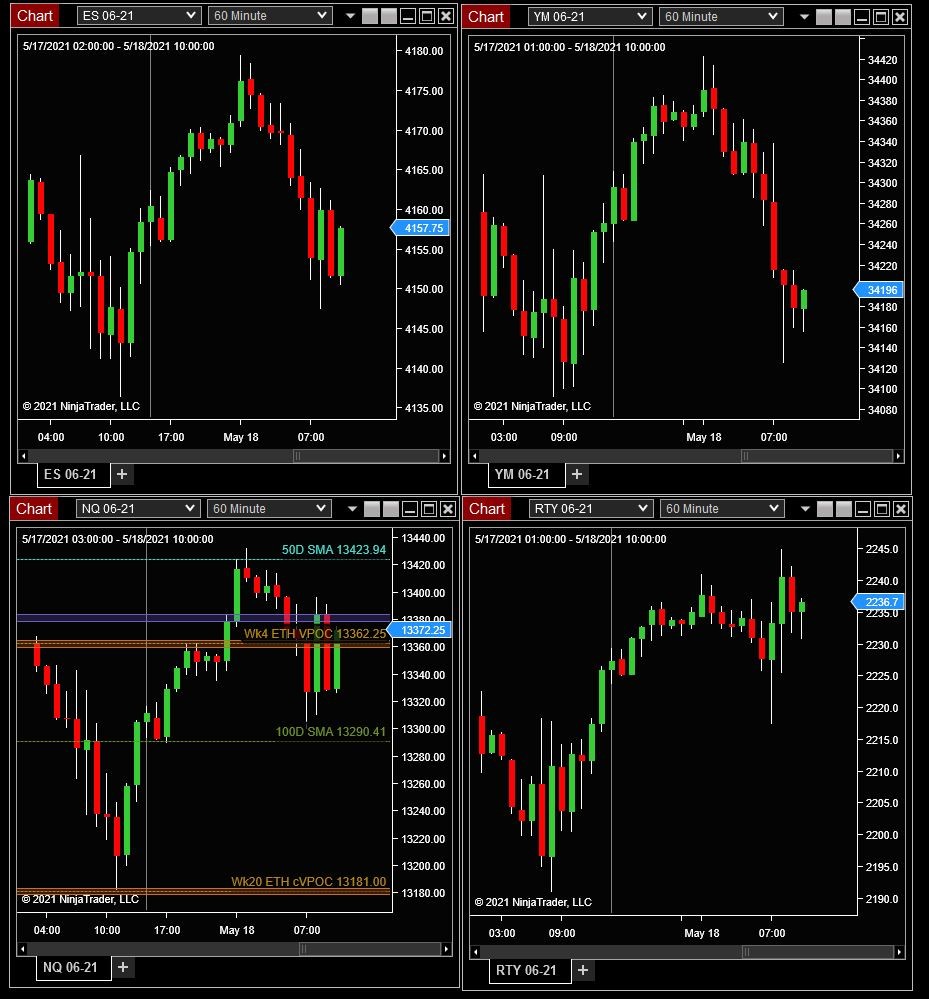 Ultimately, I am looking to create a single chart window, one tab, with ES, YM, NQ and RTY data series arranged so that ES & YM are next to each other, NQ & RTY are next to each other, but below ES & YM. Like this: