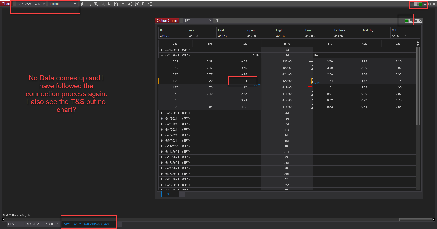 I have a connection to TD and was trying to chart some SPY options in order to use with my indicator. The T&S, chain, Level II all come up fine but not the chart on NT8? I have redone the authorization process as well with no luck in charting options.Tags: None