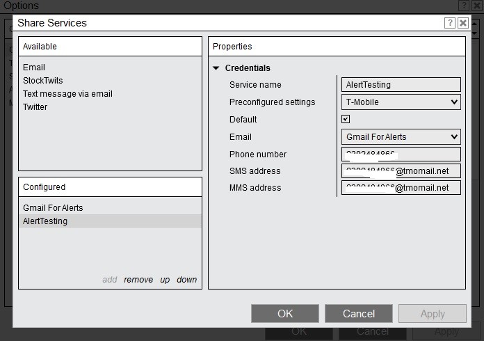 No it doesn't send alert successfully, I just hide the number of SMS/MMS address but I think it is setup correctly [email protected] that is the T-Mobile SMS/MMS address. You want me to try not adding the 10digits as prefix?Originally posted by NinjaTrader_Jason View PostI'm not a programmer myself, so I can't comment on the code.