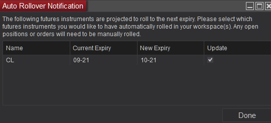 When starting NinjaTrader or opening a new workspace, a pop-up window will appear notifying you if there are any contracts within your workspace which have rolled over. Users can simply click the “Done” button to update their instruments to the latest expiration month & year.