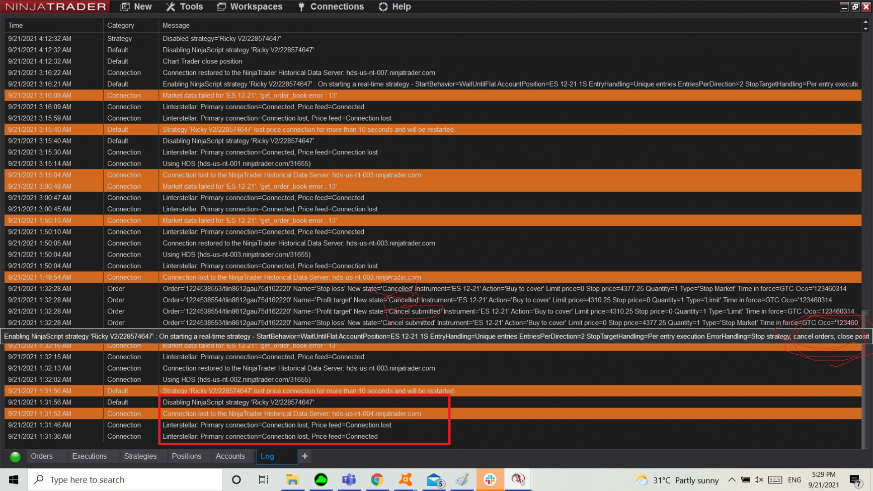 Two nights ago my automated strategy was disabled due to bad connection with the broker. on average this happens at least once every other hour with my broker and they're showing no interest in rectifying this (see log). At the time It left an open position and 2 pending stop orders. When the connection came back, it cancelled the stop orders but left the open position running well into risky territory.