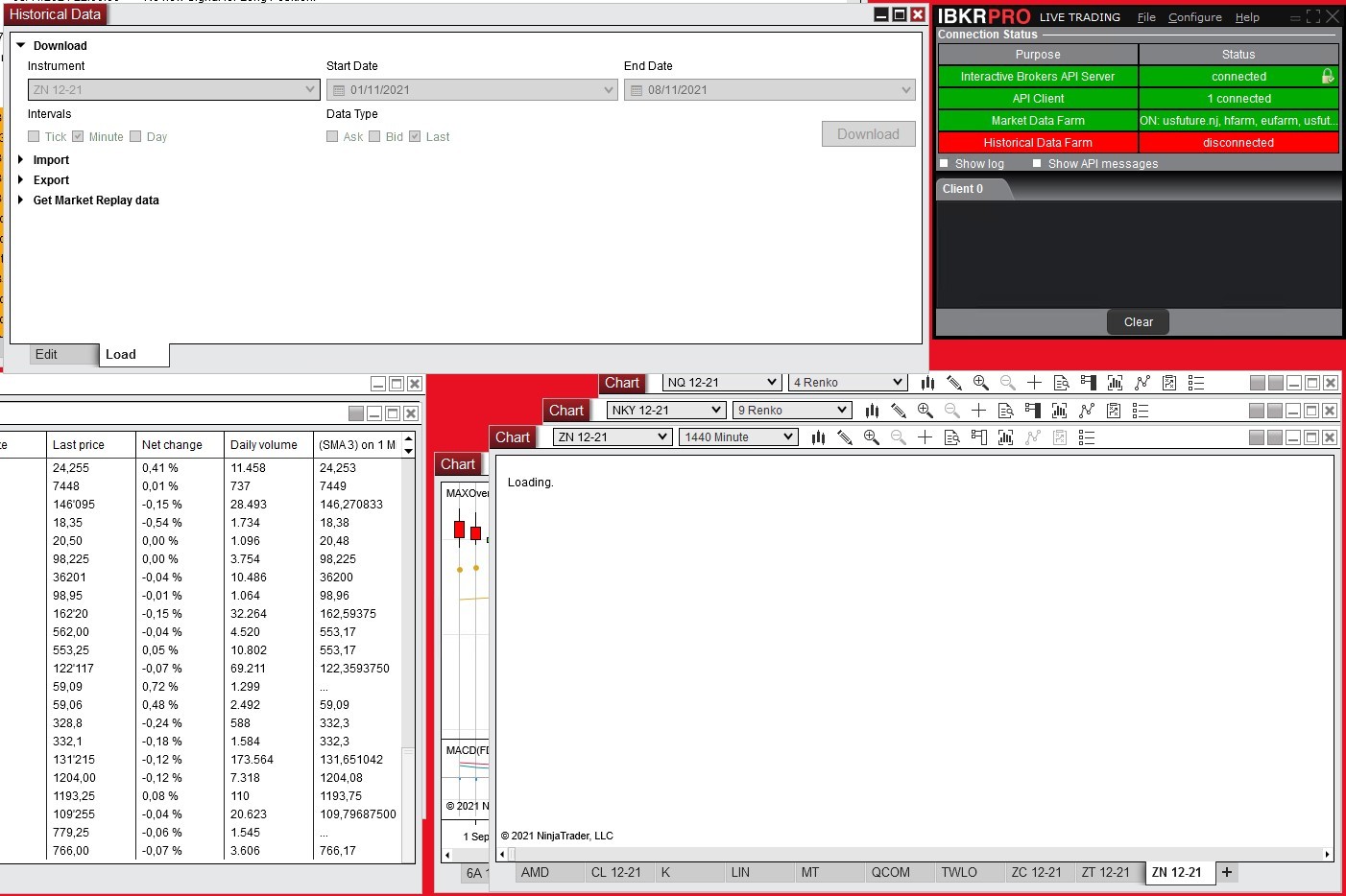 I have an issue with the ZN future in NT. The prices are updated in the MarketAnalyzer and they are recorded (I like to record them) but they are not shown on the chart. I tried to re-download historical prices for the ZN future but the window got stuck and no "I want to download"-message was send to IBG (I tried to make that visible in the screenshot attached).